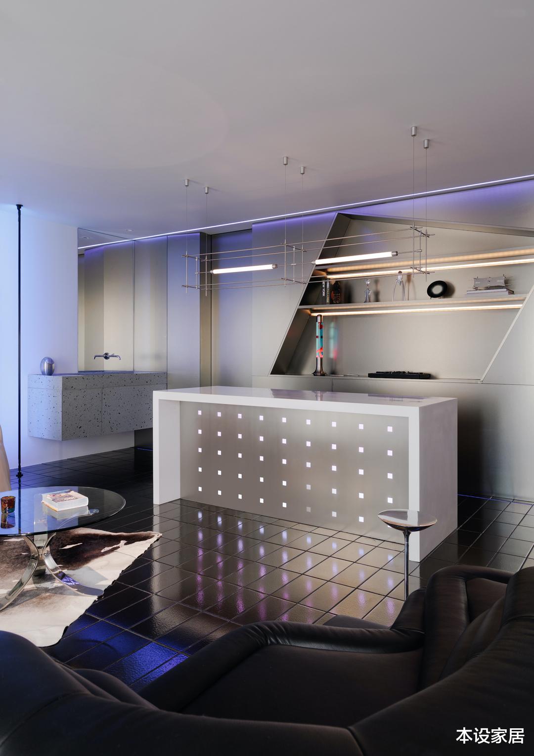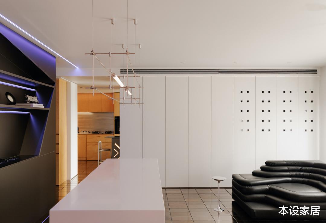 当夜幕降临时,把灯光调成派对模式的2700K,底部冲孔不锈钢灯膜就会散发出渐变的黄紫光,与开放格内的两条RGB灯带,交叠成迷幻光谱,就化身为调酒、DJ打碟的控制台,你说酷不酷?