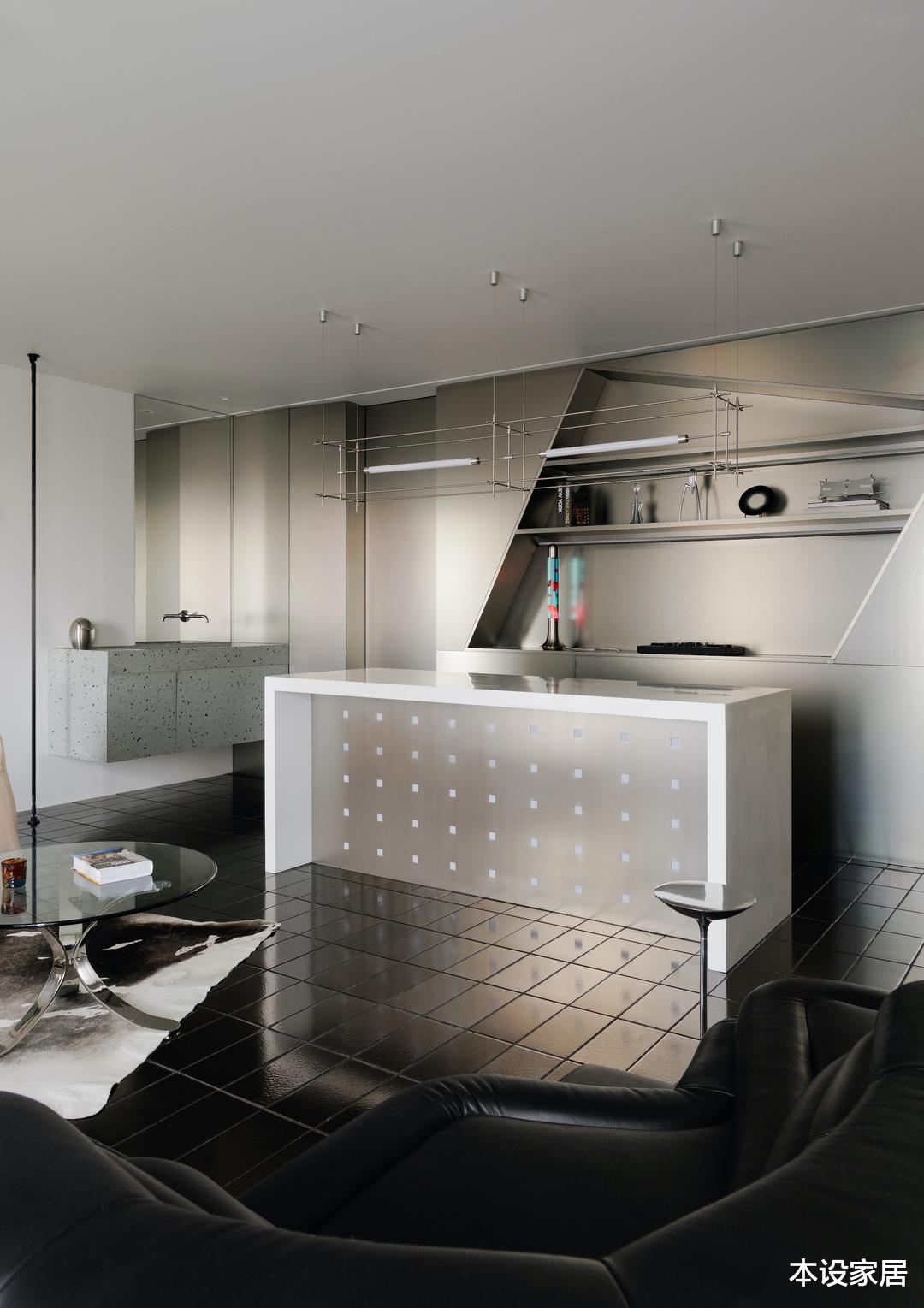 不锈钢柜的正面,中间的开放格采用不规则三角形的切割设计,未来感十足。