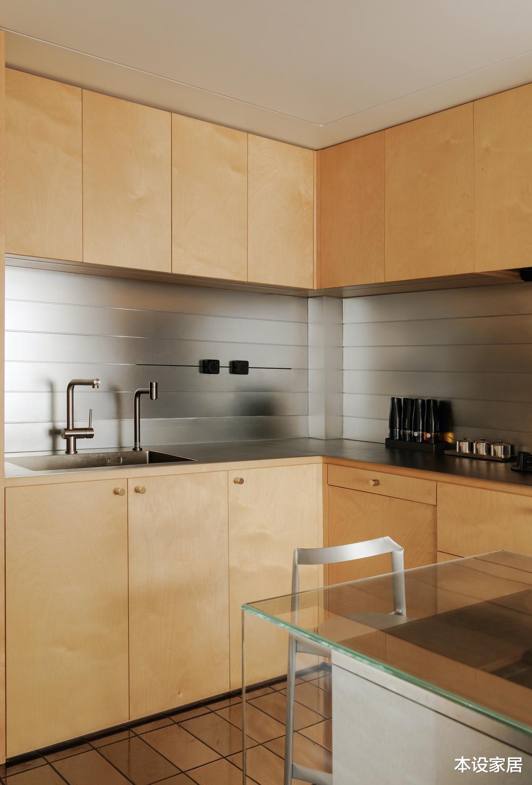 冰箱摆放在厨房的入口处,符合动线,让拿-洗-切-炒-上桌更加顺畅,不锈钢台面耐磨好打理,与桦木色橱柜搭配得相得益彰,温馨,充满生活感。