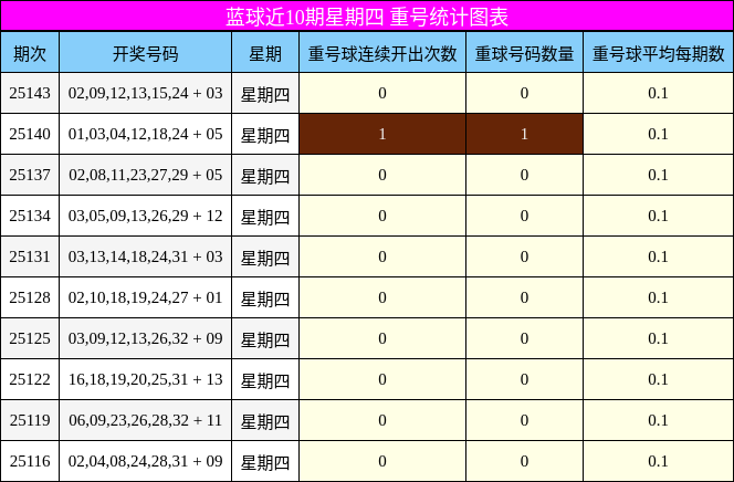 下图展示了近10期星期四蓝球重号统计情况,清晰显示重号出号节奏波动明显,但长期平均值稳定在1个/期,当前断期后具备较强回归预期。