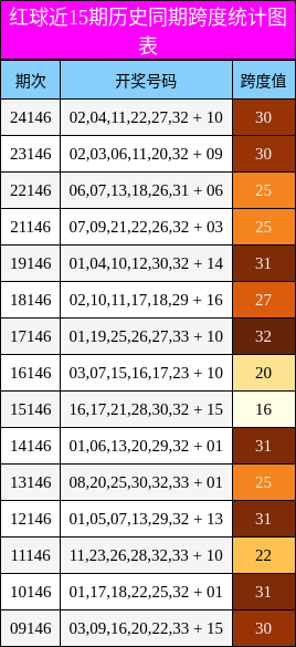 下图展示了近15期历史同期红球跨度变化趋势,可清晰看到近期跨度波动频繁,但整体重心下移,尤其在第25145期后,已连续两期处于低位运行,预示着小跨度可能成为本期主旋律。