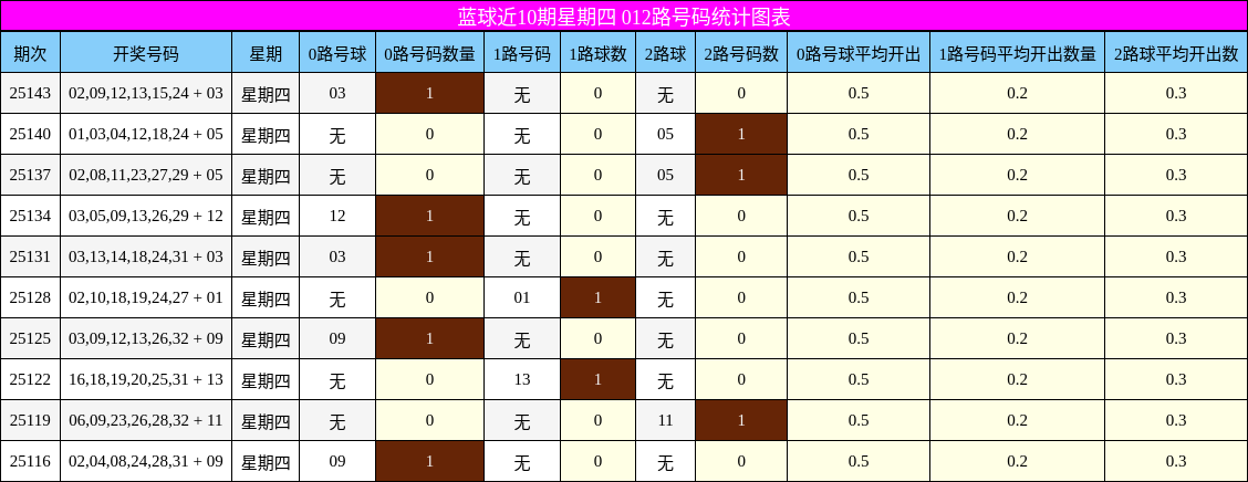 下图展示了近10期星期四蓝球012路分布,显示0路虽整体偏多,但近期连续两期未出,存在补位需求。