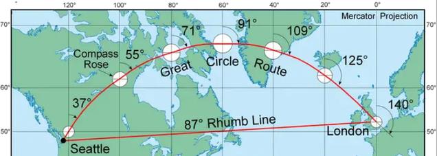 墨卡托投影地图纬度越高,放大倍数越夸张既然墨卡托投影带来了如此严重的面积变形,那为什么还要使用它呢?原因在于墨卡托投影对于航行需求依然有着重要价值:即等角航线(Rhumbline)在墨卡托投影中表示为直线,船只按照等角航向航行时,不用改变方位角,就能从起点达到终点。例如在墨卡托投影中,有一个常见的误区:地图上两点之间最短的路径不一定是连接它们的直线段。像从英国伦敦飞到美国西雅图的民航航线是这样的(下图弧线):