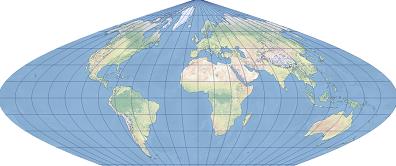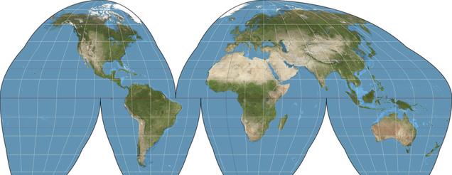 接下来我们看看还有哪些有趣的投影:古德投影是美国地理学家古德于1923年所提出,这是一种用分瓣法表示的等积伪圆柱投影。他将全球分成北美洲、南美洲、非洲、欧亚洲、大洋洲五部分,就像剥开的橘子皮一样,这样的分割方法,可以让大陆板块的变形程度降到最小,是地球展成平面后,最真实的一面。这种投影最大程度地减少了几何形状的失真;不足之处是无法完整地呈现各个大洋的形状。