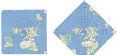 皮尔斯梅花地图投影显示了一个方形的世界。该投影为等角投影,但方形四条边的中心处除外。在其原始设计中,以北极为中心,由此可将赤道显示为相对于投影边进行旋转的方形。此投影的一个有利属性是可以进行细分或镶嵌以获取世界航线图。