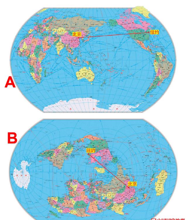 图自:《中国国家地理》2013年11期下图中,A图是传统地图中北京飞纽约的航线,B图是同类航线中距离最短的一条,单程飞行比过去减少3个多小时。在“北半球版世界地图”(B图)上,可以直观地标注这条“北极航线”,(即是前文提到的大圆航线)。但在传统世界地图上,北极点地处图幅的最北端,“北极航线”无法标注,所以我们更多看到的是这条经过太平洋的航线,这其实是个错误概念。除了标注航线等实际应用之外,世界2/3的陆地和4/5的国家都位于北半球,因此“北半球版世界地图”尤显重要。