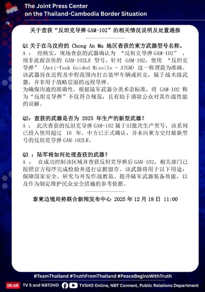 但就在当地时间12月18日,事情出现了反转。泰国泰柬边境局势新闻发布中心专门用中、英、泰等多种语言,就查获的反坦克导弹一事发布了详细的情况说明。