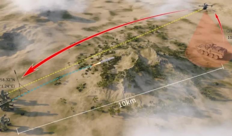 另外,GAM-102LR还有第三方引导模式,可以由前方的侦察兵和无人机定位目标,然后将坐标回传到发射小组的终端上,然后导弹发射后按照坐标飞行,靠近后射手再通过回传画面锁定。