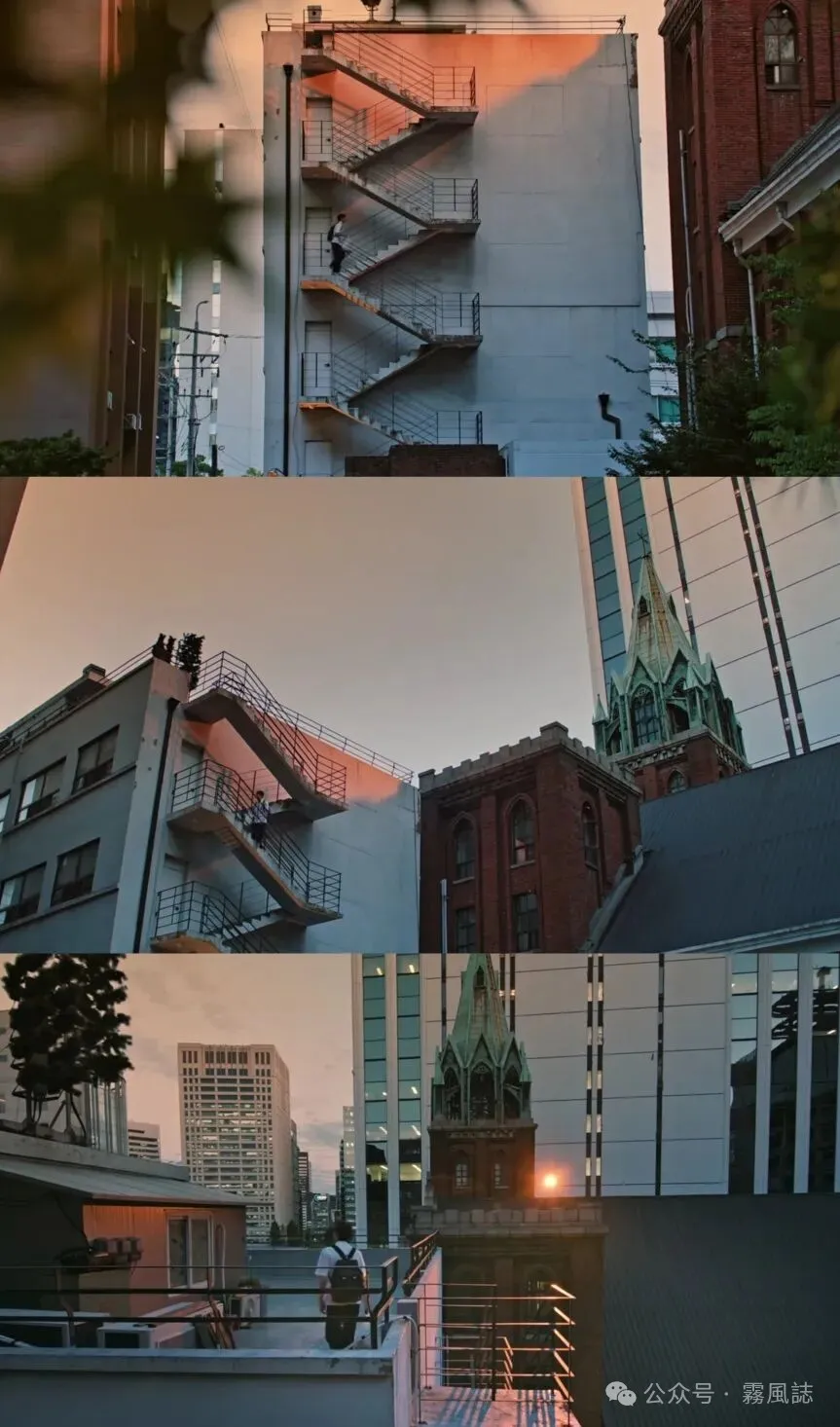 摄影上也充分利用了镜像的效果,比如高中时期雅珍住的屋塔房,通过旁边高楼玻璃反射的落日余晖,第一眼就觉得唯美,也是剧中少有的暖调色彩。