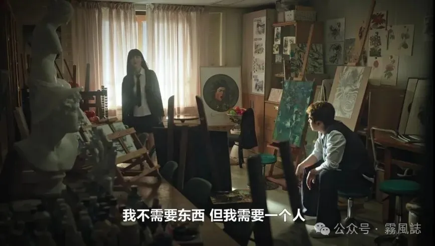 比如美术教室的布景:整体是一个昏暗拥挤的封闭式构图,一站一坐彰显两人权力关系;雅珍背对窗外光源面部是暗的,示意着她的动机并不单纯;位于画面视觉中心的道具即雅珍旁边架子上的画,一个男人的头像显得尤其突兀与诡异,整个场景都是在为雅珍“收编”金在伍,利用他、让其为她所用的情节服务。