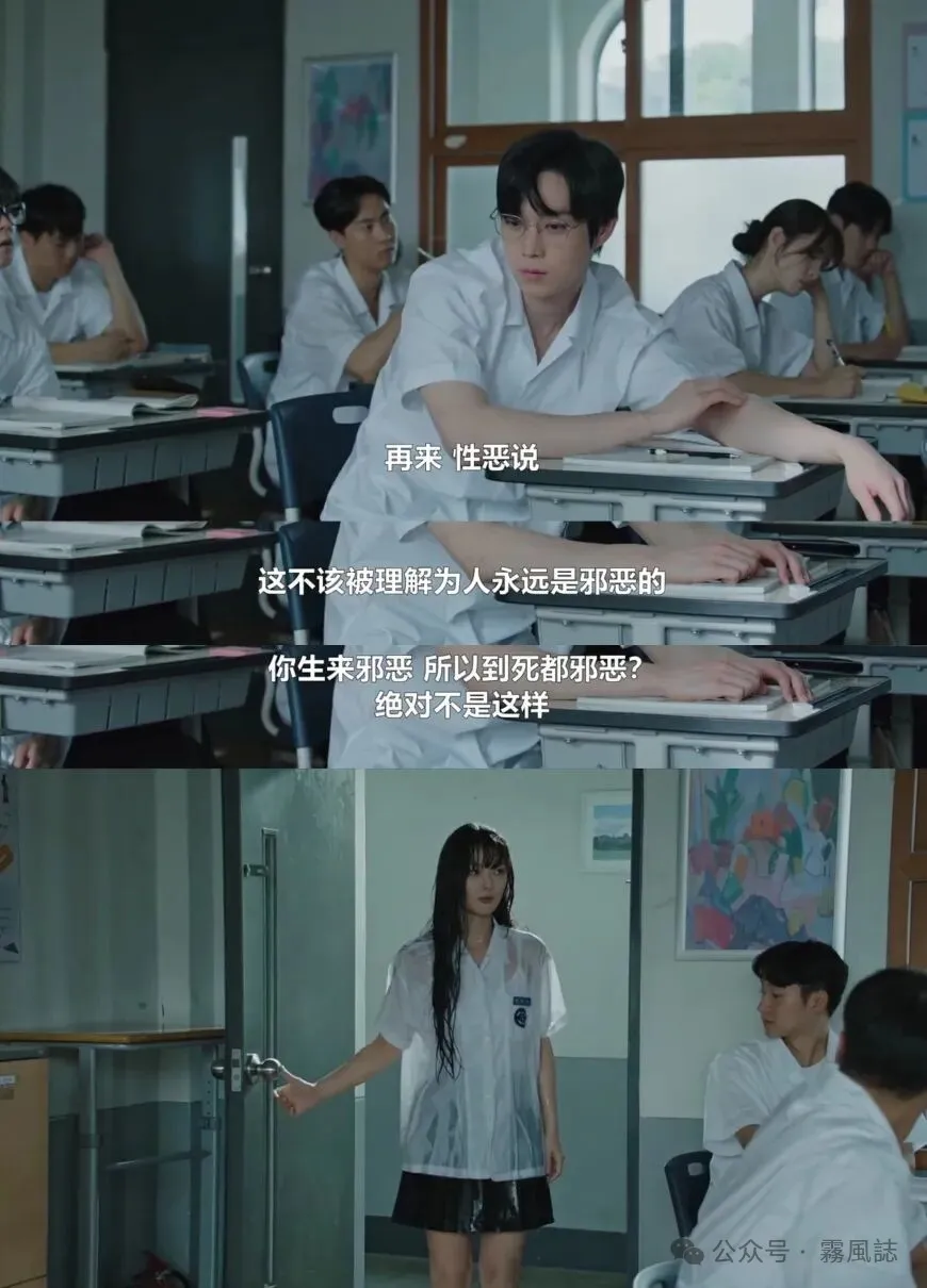 还有教室上课的场景,尹俊瑞在睡觉、醒来发现雅珍不在座位上,画外音是老师上课的声音,这一段上课内容正好在讲“性恶说”,是特意选择的、符合主题的内容。作为反社会人格的雅珍是否完美符合性恶说,还是后天环境的产物呢?