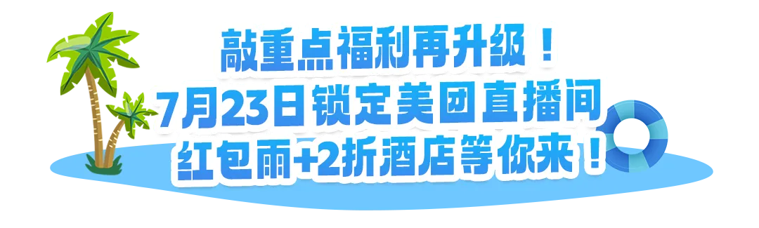 7月23日锁定美团“王牌奇妙 yeah”直播间,2折抢王牌酒店,叠加专属补贴1998-400、998-200,住得越好省得越多,把KPI和PPT全扔给海风就够了!