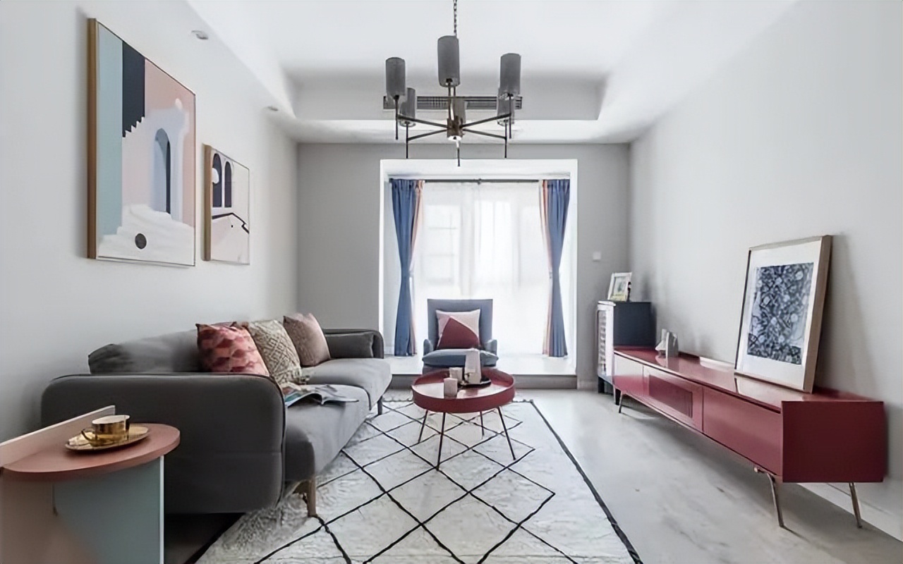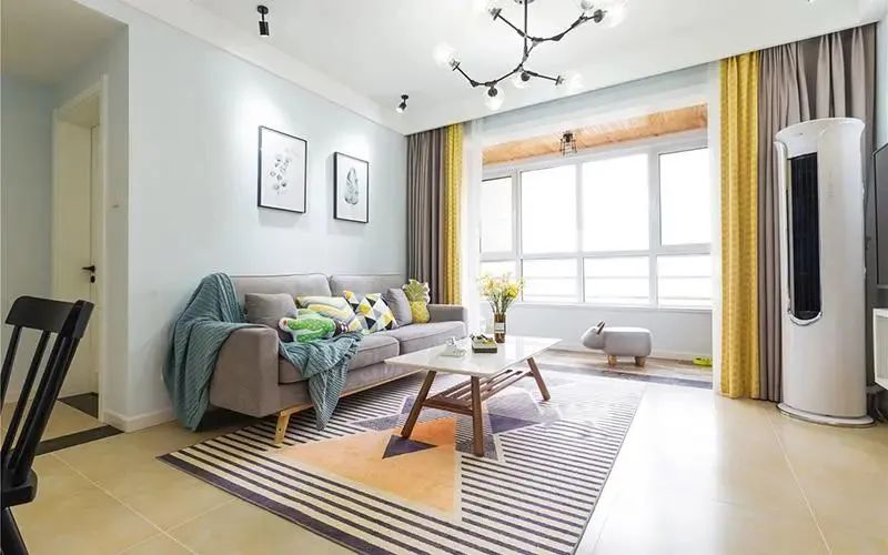 把北欧几何图案、马卡龙色系、原木质感的软装(如抱枕、窗帘、小边几)融合在一起,不会显得多余冲突;