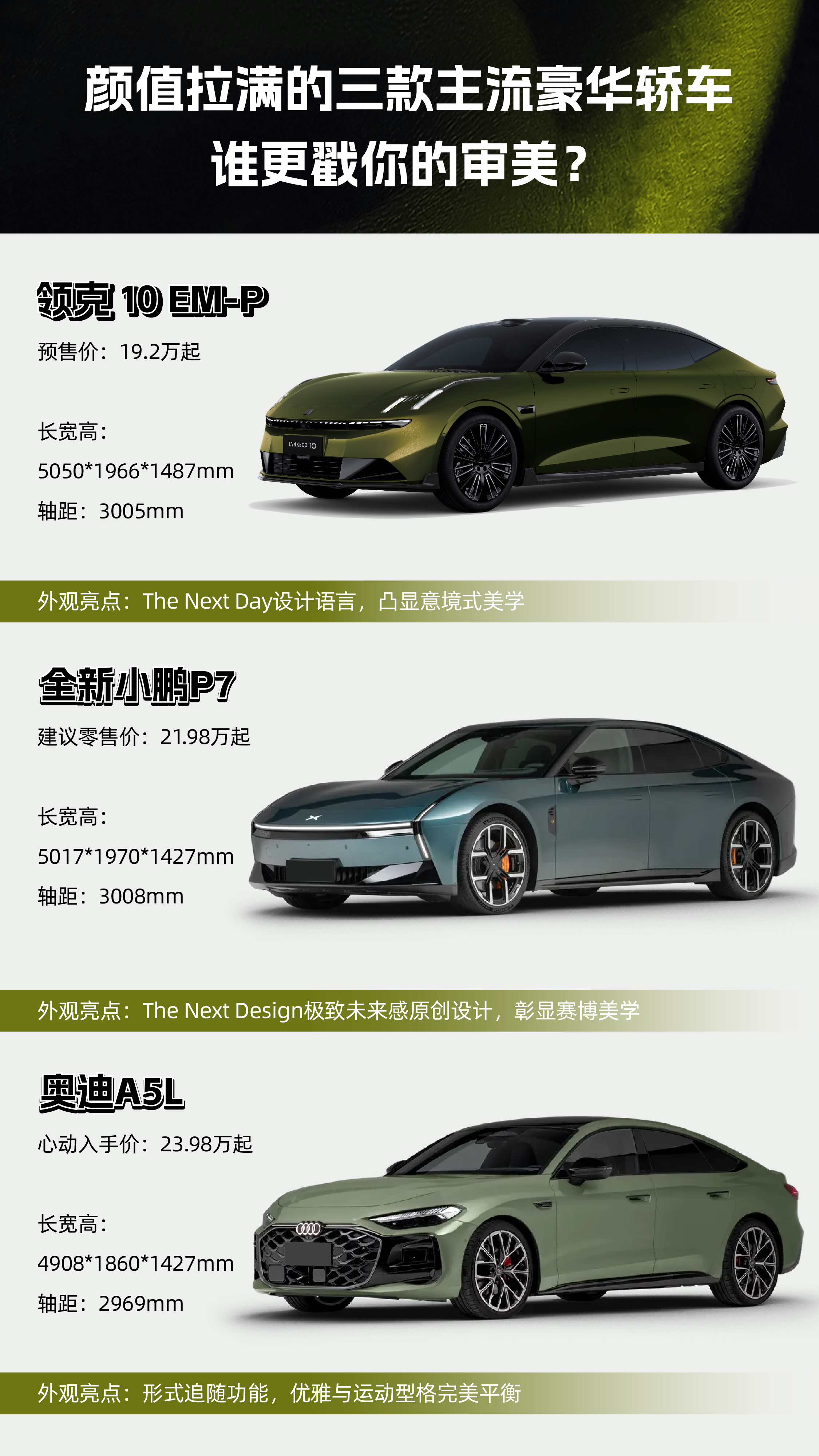 从三款车型的核心参数与配置来看,其技术路线的差异直接对应不同用户的需求场景。插电式混动的领克 10 EM-P,适合注重多场景出行灵活性,同时对动力和智能配置有较高要求的用户;纯电驱动的全新小鹏 P7,更契合追求极致加速性能与前沿智能体验,且日常出行以短途为主或具备充电条件的用户;燃油动力的奥迪 A5L,则针对偏爱传统豪华品牌质感,重视驾驶线性输出与品牌附加值的用户。消费者在选购时,可基于自身能源补给条件、日常出行场景、对动力性能的需求以及品牌偏好,结合三款车型的具体参数,做出符合自身需求的选择。