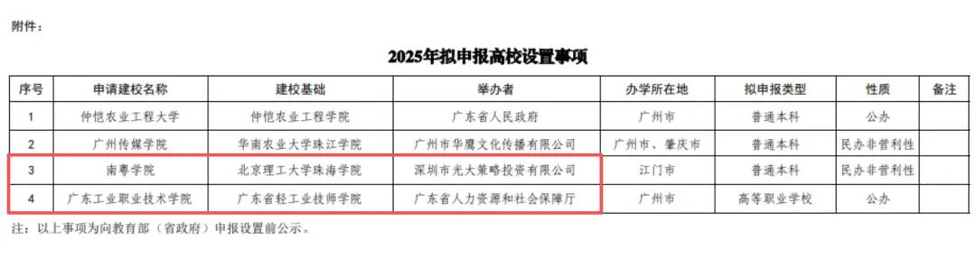 刚刚,广东省教育厅发出公示:拟向教育部申报的北京理工大学珠海学院转设为广东南粤学院、以广东省轻工业技师学院为基础设立广东制造职业技术学院。