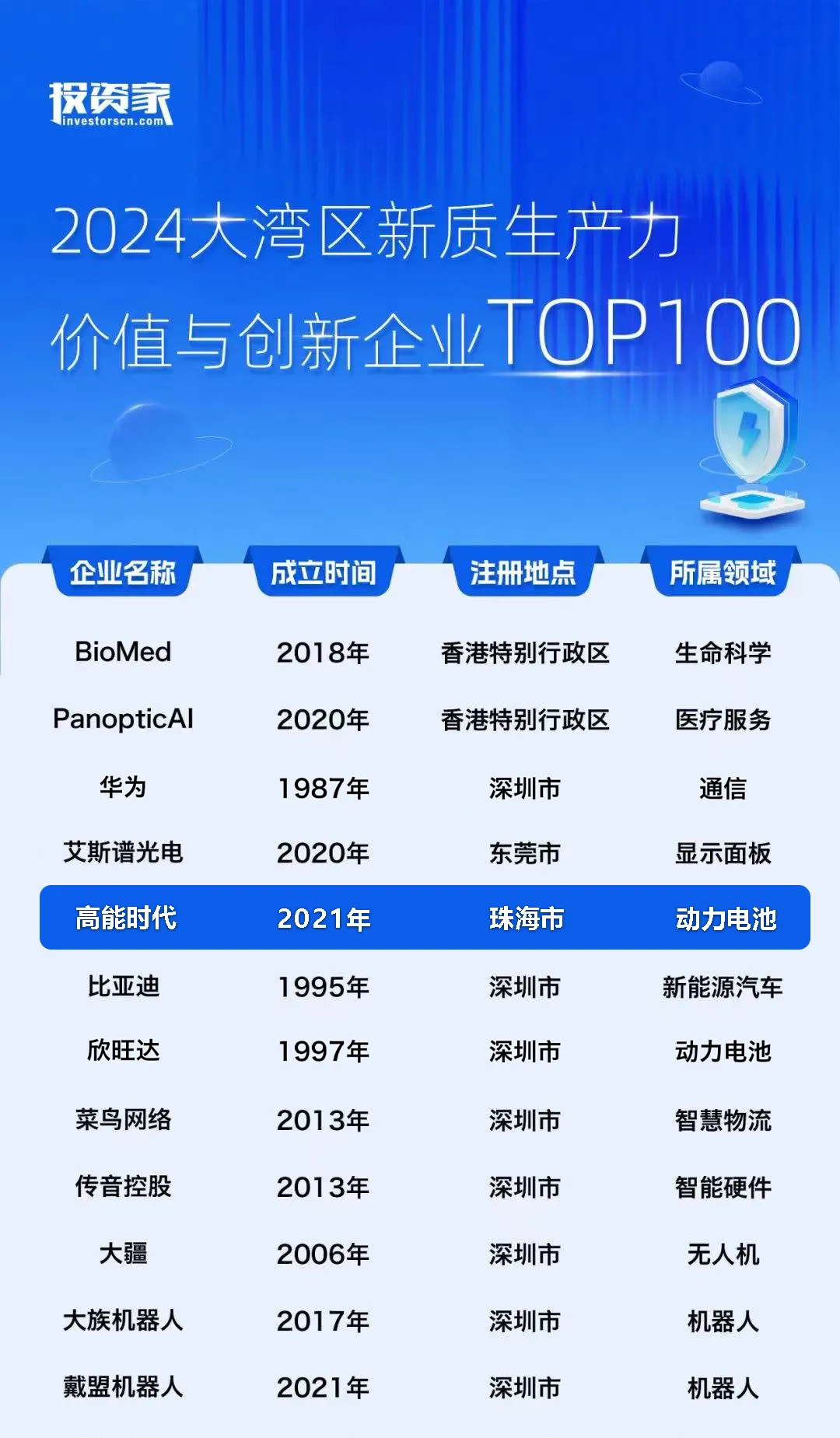此次评选由投资家网旗下投资家研究院发起,旨在挖掘对粤港澳大湾区具有贡献意义的企业,共吸引2100多家企业报名参与。在参选的AI、智能制造、新能源、芯片半导体、生物技术、商业航天等领域的创新企业中,结合融资、技术、产品、团队、影响力五大维度评估,最终评选出比亚迪、大疆、华为、小鹏汽车、欣旺达、高能时代等大湾区新质生产力代表企业。