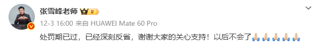 值得注意的是,12月3日,央视新闻报道,抖音主播“张雪峰”因直播中长时间使用污言秽语,相关账号限期禁言、停播。随后,张雪峰发文表示,“已经深刻反省,谢谢大家的关心支持,以后不会了”。近期,张雪峰复播并且戴上了眼镜,他表示,“为了跟之前的自己划清界限,从今天开始直播戴眼镜。以后看到我戴眼镜直播的时候再说脏话,直接给我举报,加倍处罚。”