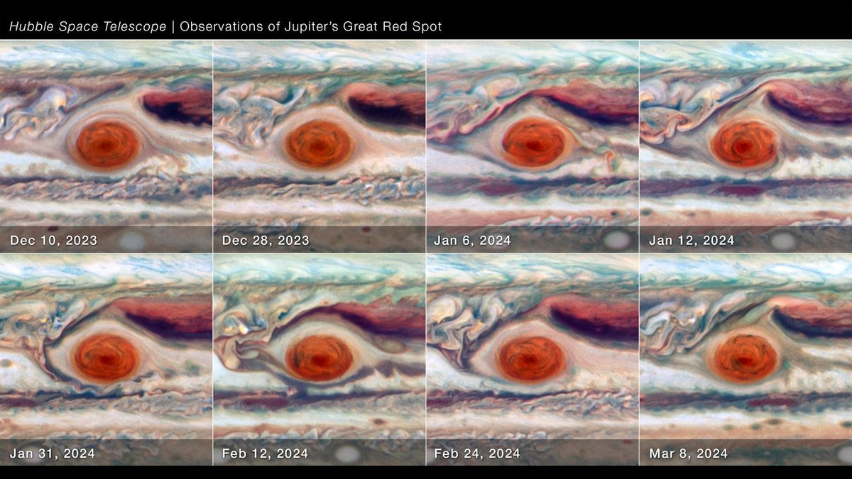 哈勃太空望远镜在2023年12月至2024年3月之间对木星的大红斑进行了详细观测,发现这一巨大的反气旋风暴每隔大约90天就会发生振荡,似乎在不断被挤压和膨胀。然而,更令人惊讶的是,它不仅在缩小,还呈现出一种周期性变化:大红斑沿着其半长轴方向时而膨胀、时而收缩。这种现象的发现,打破了人们对大红斑只是在逐渐消失的传统认知。