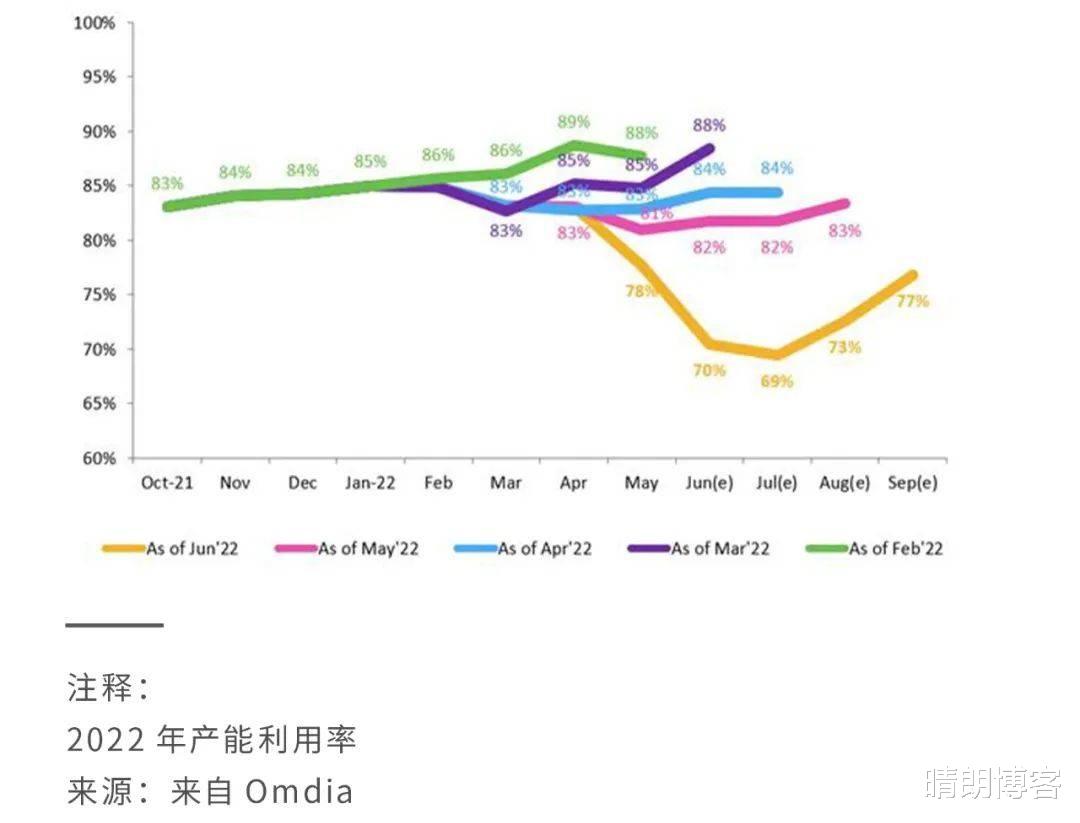 比如LCD电视机显示面板,价格在6月降至新低,原因是电视厂商第二、三季度继续削减需求。为此,显示面板制造商从6月起大幅降低产能利用率,根据Omdia的追踪报告,6、7月产能利用率预计将分别降至设计产能的70%和69%,创十年来最低值。
