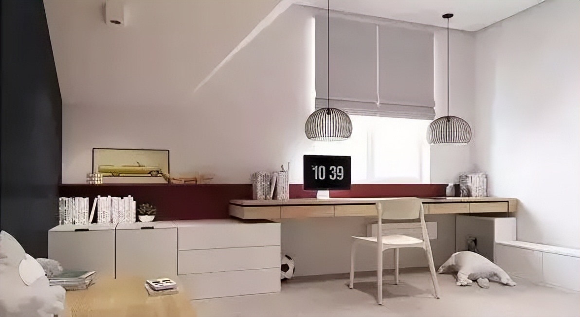 ♥ 3、靠窗边设计的学习区,通风及采光条件极好,悬挂式的吊灯点亮了空间。