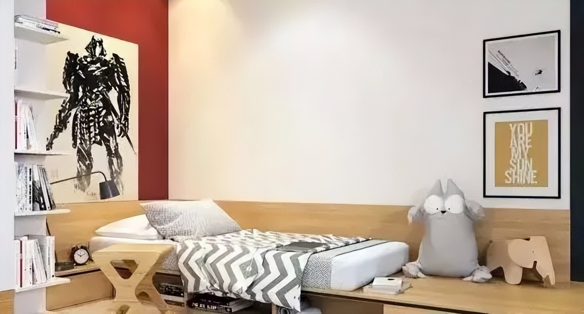 ♥ 3、床的对面即是俩娃的学习区,墙上隔板收纳柜放置一些书籍及玩具 ,
