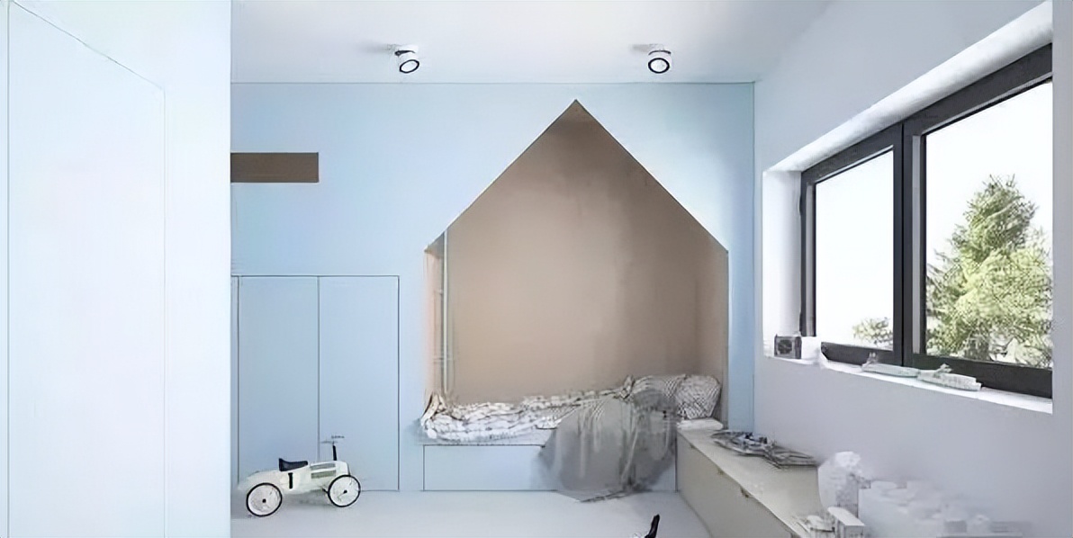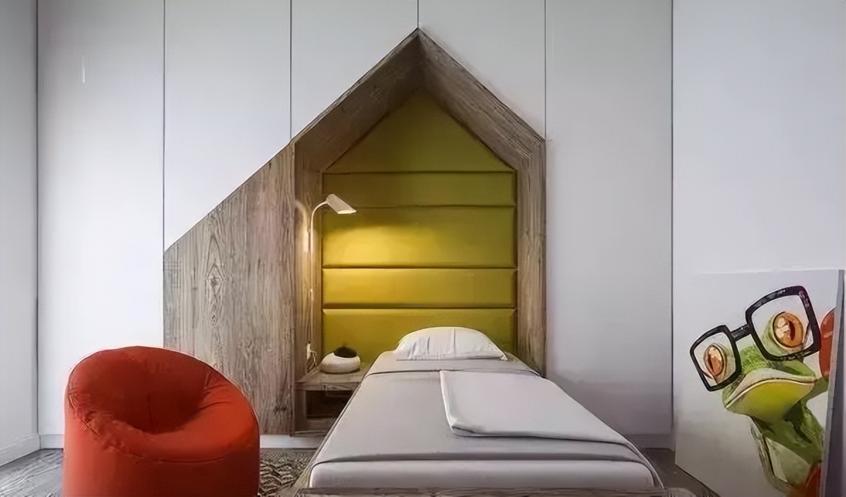 ♥ 2、衣柜和床头背景墙结合设计,解决了收纳需求,小木屋形状的床头设计满足孩童丰富想象力,趣味性十足;