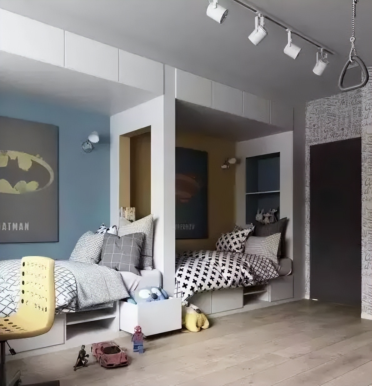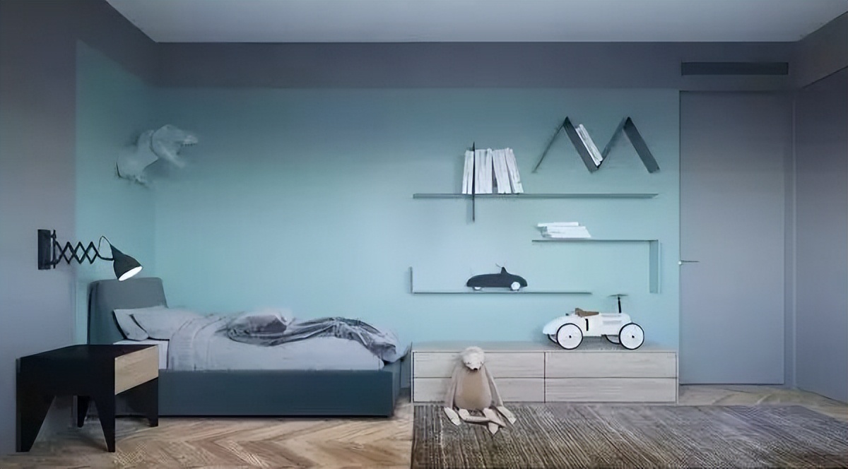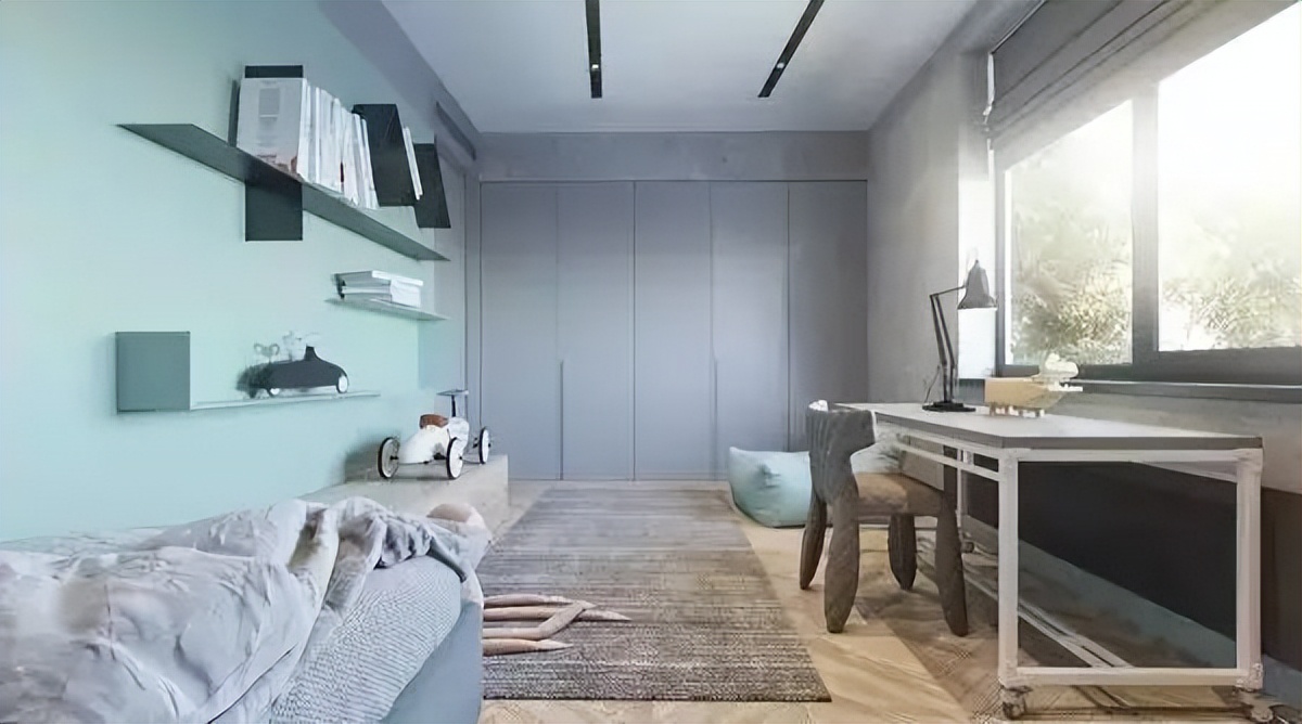 ♥ 1、男孩房,选择清爽的淡青色+灰色做主色调,床头灯安装在墙上,避免经常“站不稳”;