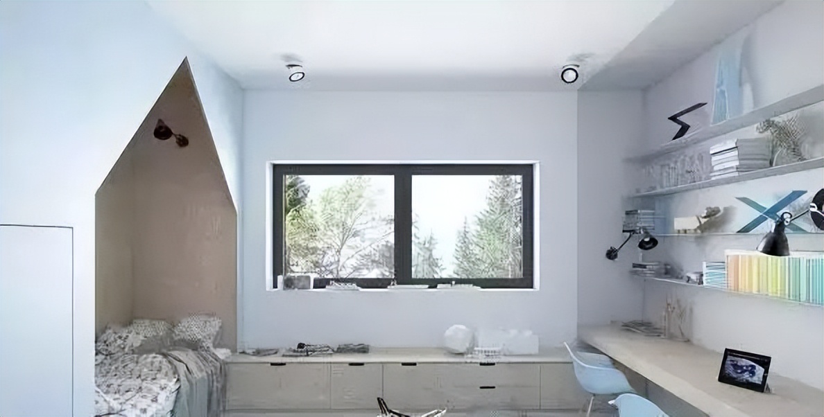 ♥ 1、没有选择上下床的形式,而是另辟蹊径在房间一侧同一直线上划开了2个小空间安置床,床与床之间通过窗口连通;