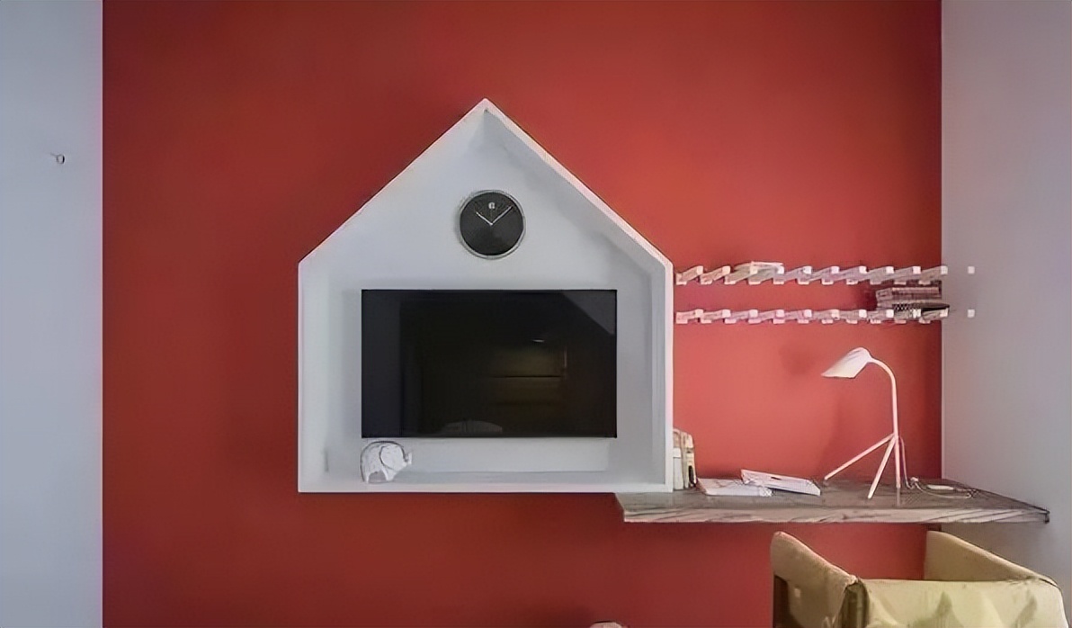 ♥ 3、床头背景采用了亮黄色,电视背景墙采用的是大红色,连沙发也是红色的。大色块装饰空间,萌趣可爱。