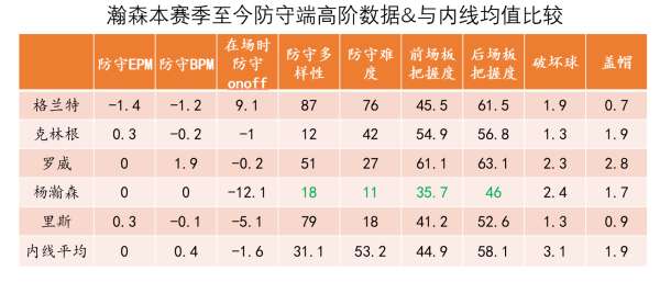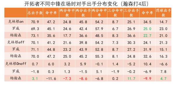 从这张图中我们也看到克林根和瀚森在这两项数据上都非常出色,事实上他俩在防守端的特点确实非常相似、都是擅长沉退护框的类型,能够凭借位置感给予对手的投篮较大的干扰,所以瀚森作为克林根的替补是能够保证开拓者防守策略的延续性的。