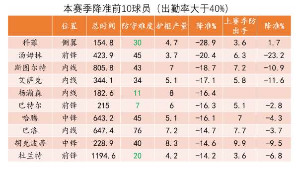 首先我们要来分辨下降准率这个数据的含金量,于是我找出本赛季NBA所有出勤率大于40%的球员(过滤掉只打垃圾时间的)并按照他们的护框降准率进行排序,从表格中可以看到里面混入了一些非中锋球员比如科菲、巴特尔等等,他们本赛季的护框降准率非常夸张但上赛季却非常一般。事实上哪怕是表格里的中锋球员,其护框降准率也并不稳定,比如哈滕、巴洛上赛季的护框效果在中锋里并不好。