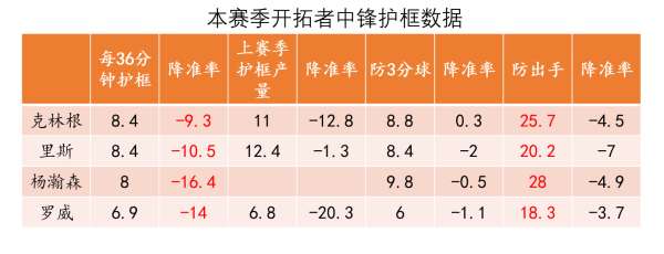 另外我们要指出的是本赛季开拓者4名内线球员的护框降准率都非常不错、而且他们的每36分钟护框产量也相当接近。所以降准率高更多是来自于开拓者的防守策略对于油漆区的保护做得非常到位,中锋大多是沉退在油漆区附近的、自然能给到很好的干扰效果。