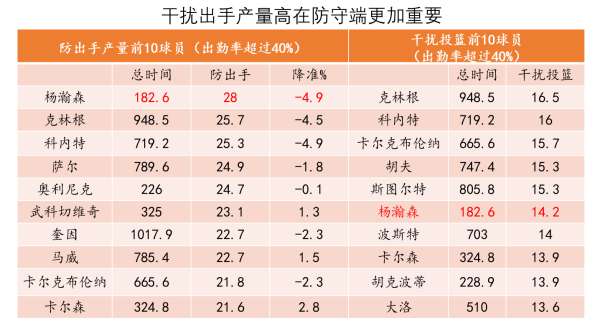 比如上表中的两个数据,第1个是每36分钟防对手出手产量的前10球员,这个数字体现出内线球员对于对手投篮的干扰能力。从表格中前10的名单就可以看到里面包含了大量知名中锋球员,而瀚森目前该数据在所有内线里能排到第1名,说明他在防守端总能出现在投篮人的面前给予一定的干扰。