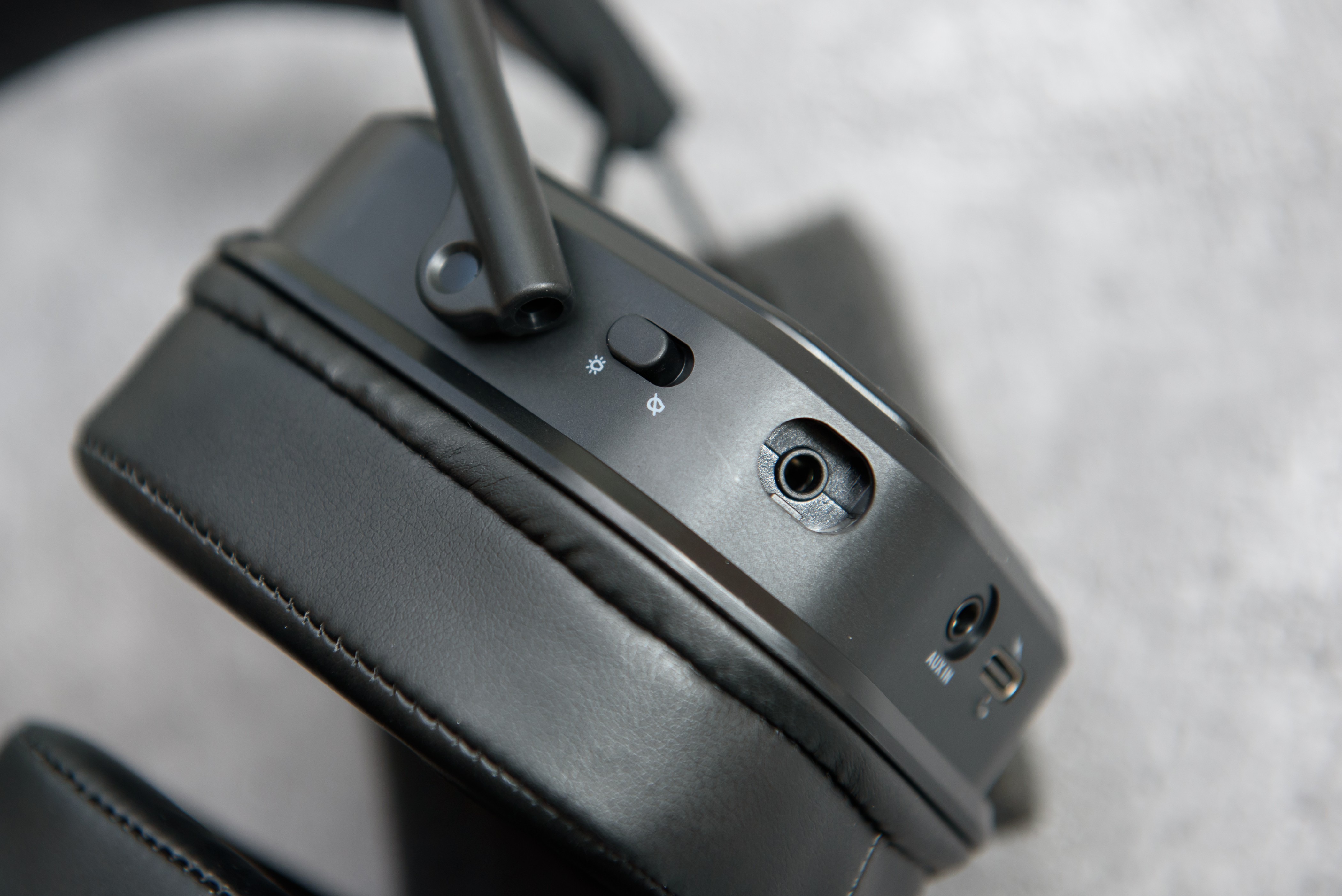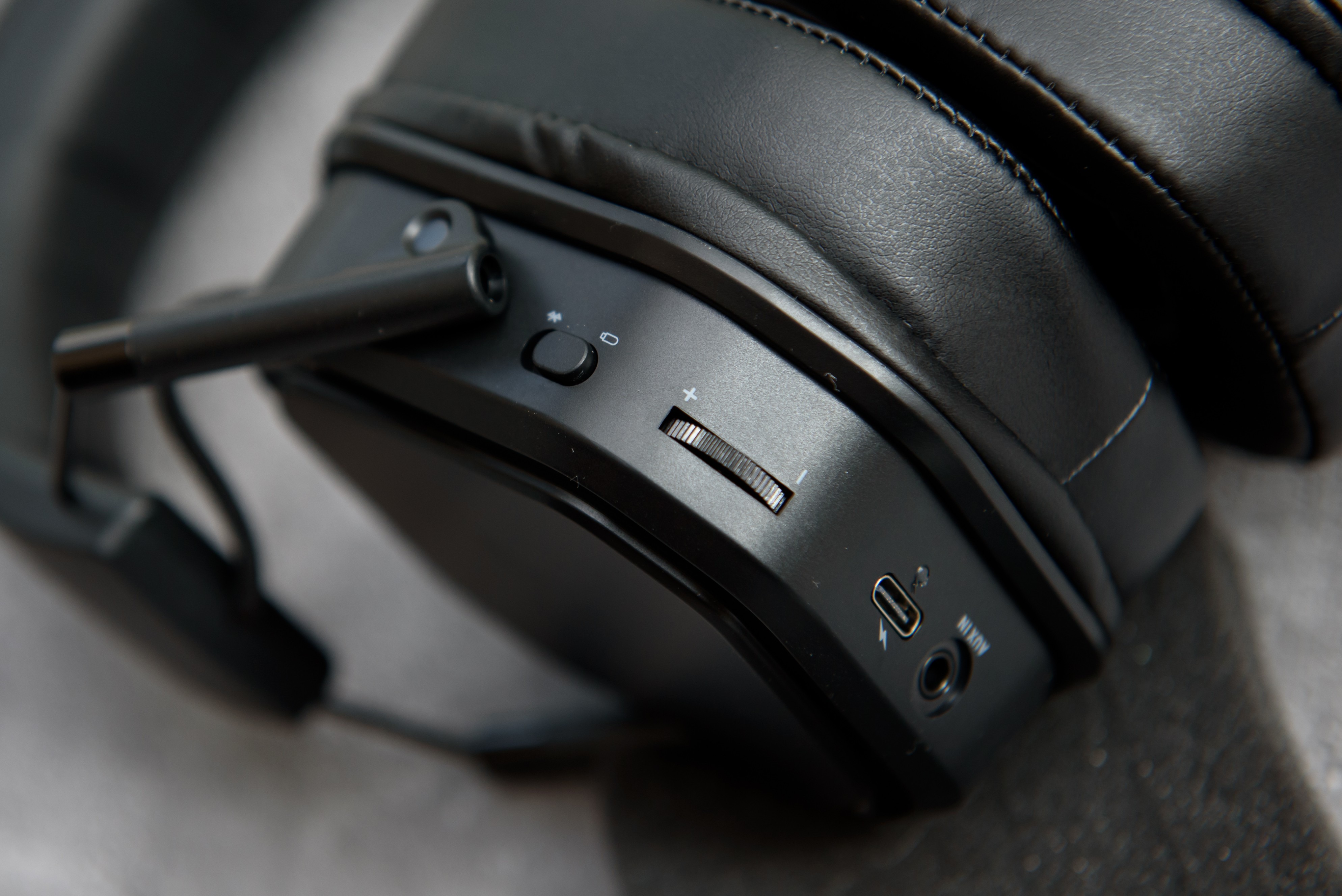▼ 耳机除了电源开关外, 所有控制全部集中在了左侧耳罩,依次为蓝牙/2.4G切换按钮,音量调节旋钮,AUX线口,TYPE-C充电口,RGB灯效开关及可拆卸全指向降噪麦克风接口, 玩家使用一只手可以完成全部操作。
