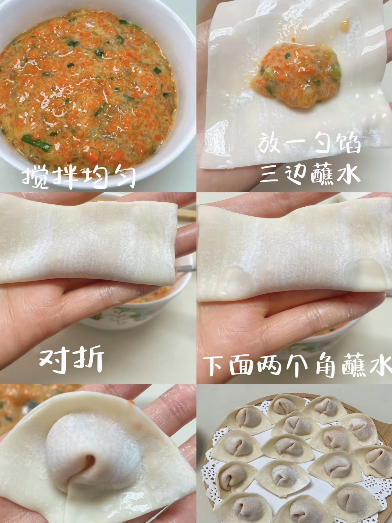 馄炖皮讲究“薄如蝉翼”却不破。菜市场最便宜的“方形小薄皮”就行,别买饺子皮,那是“厚被子”。包法走“金鱼尾”路线:放一勺馅,筷子压平,三边蘸水像给皮“涂口红”,对折成三角形,把空气挤出去,下面两角再蘸水,捏一起,一只“小元宝”完成。十分钟能包一座“虾矿”,排排坐像等待检阅的小士兵。