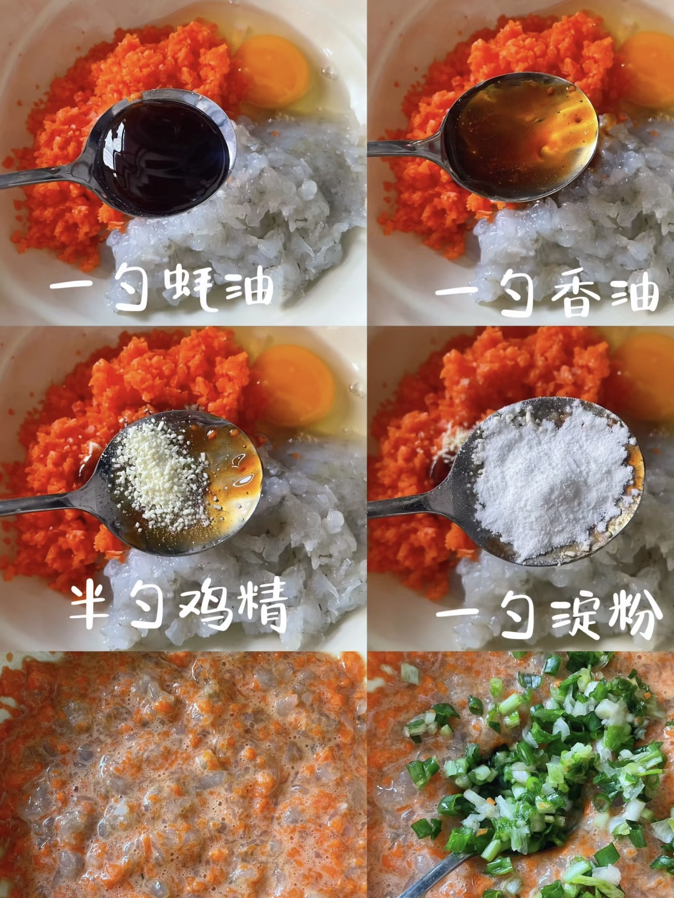 配角也疯狂。胡萝卜切细丁,像橙色小钻石,既提甜又撞色;一点点猪五花剁成“云雾状”,给虾当“润滑剂”,嫩而不柴;再抓把香菜梗碎,清新值+10086。调味只放“四宝”:蚝油一勺、香油一勺、鸡精半勺、淀粉一勺,顺时针搅到馅“抱团拉丝”,筷子插进去不倒,就是“合格上岸”。