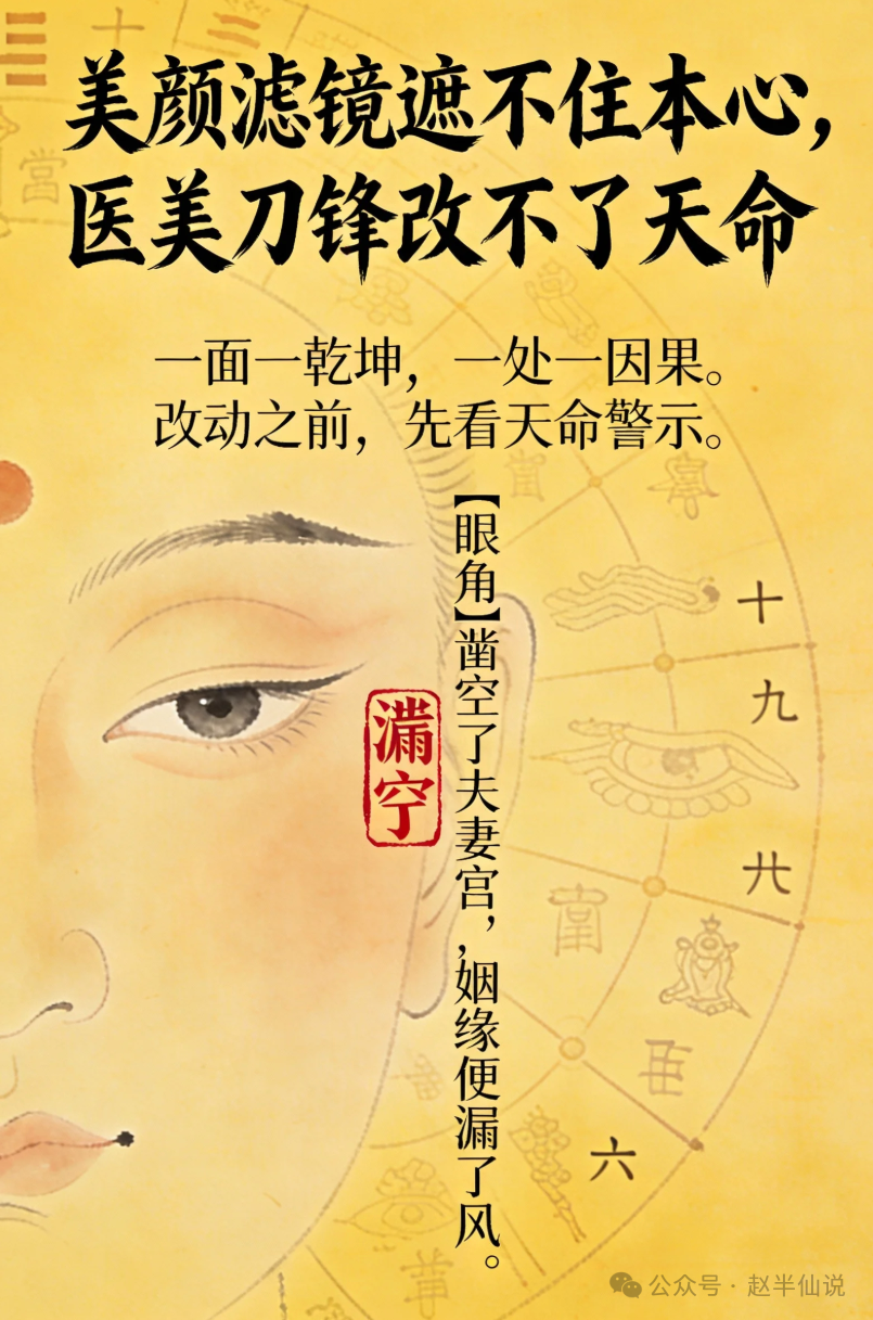 洞一凿开,烂桃花就顺着洞口往里钻,正缘则像沙子一样往外流。婚姻的裂痕,往往就从这改动后的眼角开始,先是日常的冷战不断,再是激烈的争吵不休,最后要么貌合神离、同床异梦,要么干脆分道扬镳、走向离异。更可怕的是,眼尾若是留下疤痕,不仅会影响晚年运势,导致晚年孤苦无依,还容易招惹口舌官司,被是非缠身,不得安宁。