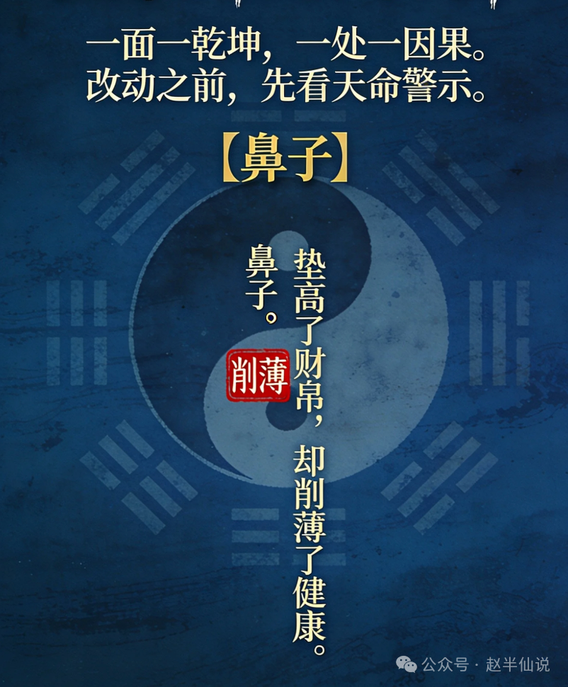 很多人垫高鼻梁后,偏财没盼来,肠胃疾病、呼吸道问题倒是先找上门来,常年被病痛缠身;也有人为了改善健康,刻意修整山根,结果健康没好转多少,财运却一落千丈,挣不到钱不说,还总破财,事业也难有起色。更要命的是,鼻子还牵连夫妻宫,山根或鼻梁一动,婚姻里的那个人也会渐渐离心,感情裂痕越来越深。若是鼻梁上留下疤痕,中年时期的破财、意外灾祸,更是躲都躲不掉,最终落得个“财病两空”的下场。