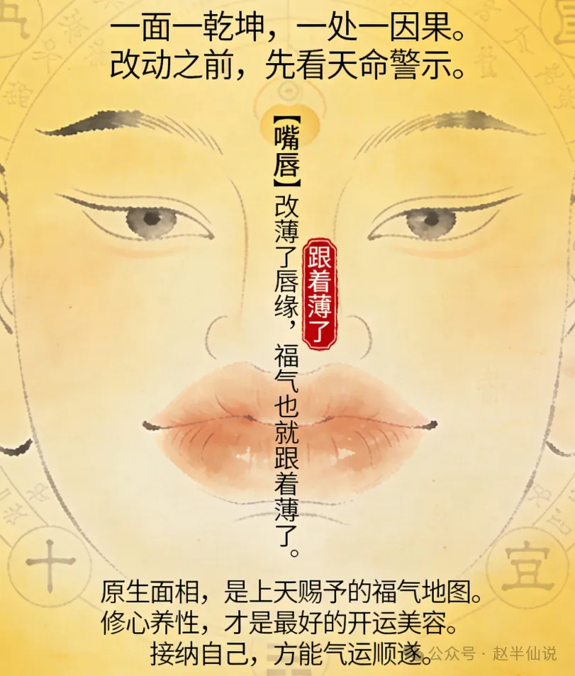 结果呢?食禄宫受损,一辈子的衣食福报都跟着减少,就算有赚钱能力,也难享口福,还容易遭遇肠胃疾病,甚至味觉受损;若是把嘴唇改薄,性格会变得越发刻薄寡恩、待人冷漠,在姻缘里不懂包容退让,夫妻矛盾频发,感情很难长久;若是过度填充导致嘴唇臃肿,会让人变得物欲、情欲过盛,桃花杂乱不堪,容易因为感情之事破财、惹是非;若是改动嘴角,会彻底破坏聚福之相,晚年口福尽失,衣食堪忧,子孙也难以尽孝,福泽难续。