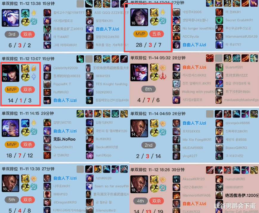而在最近,有网友就发现了Uzi账号在韩服很活跃,甚至一天打了十几把的韩服排位,从下午打到了凌晨五点半,可以说这训练量堪比职业选手了,而且玩的大多数还是版本比较热门的英雄,其中卡莎、女警、芸阿娜都拿到了比较豪华的战绩。