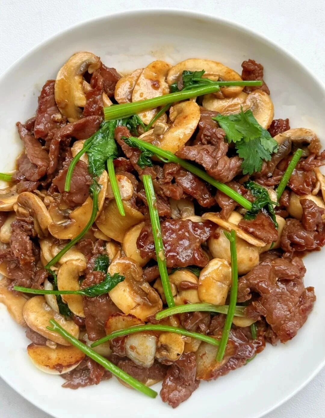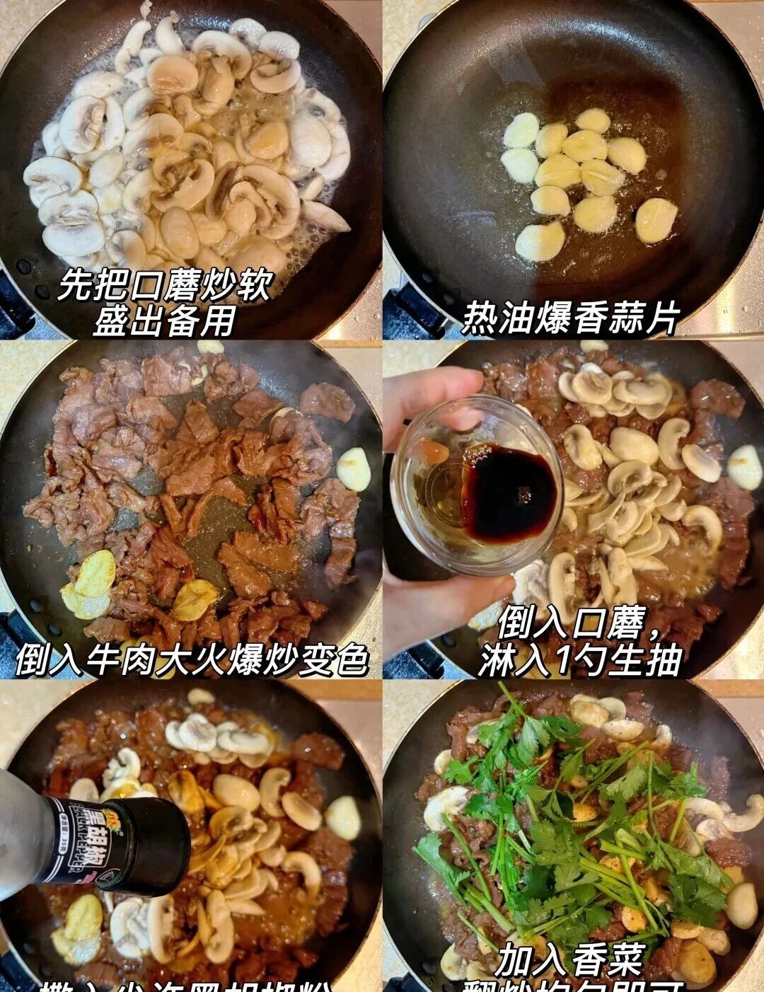 牛肉、口蘑、大蒜、香菜、生抽、黑胡椒粉、淀粉、食用油