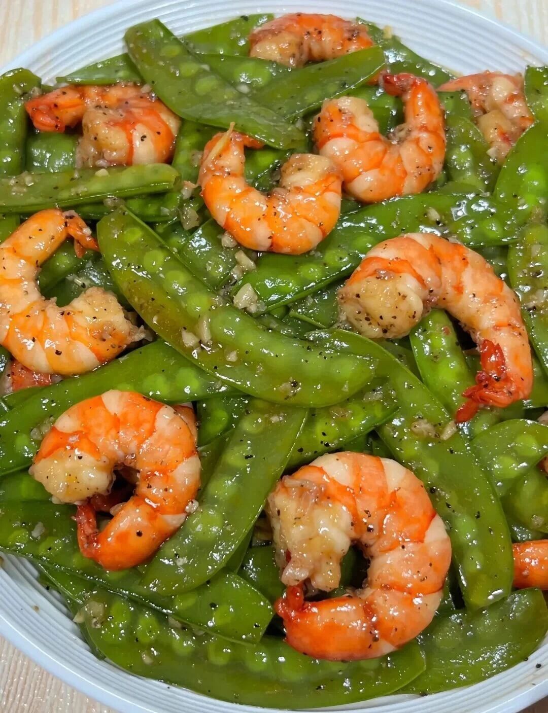 2. 热油爆香蒜末,下虾仁炒至变色,加入荷兰豆翻炒。