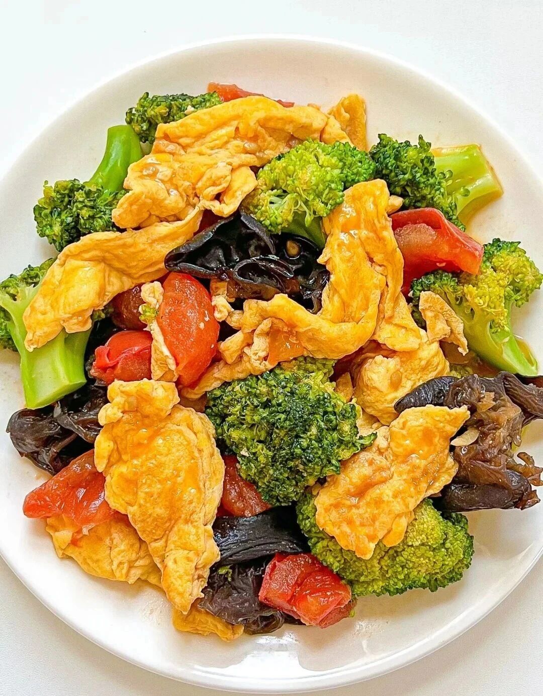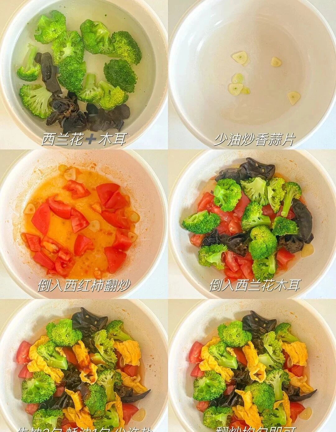 西兰花、木耳、鸡蛋、番茄、大蒜、生抽、蚝油、食用油