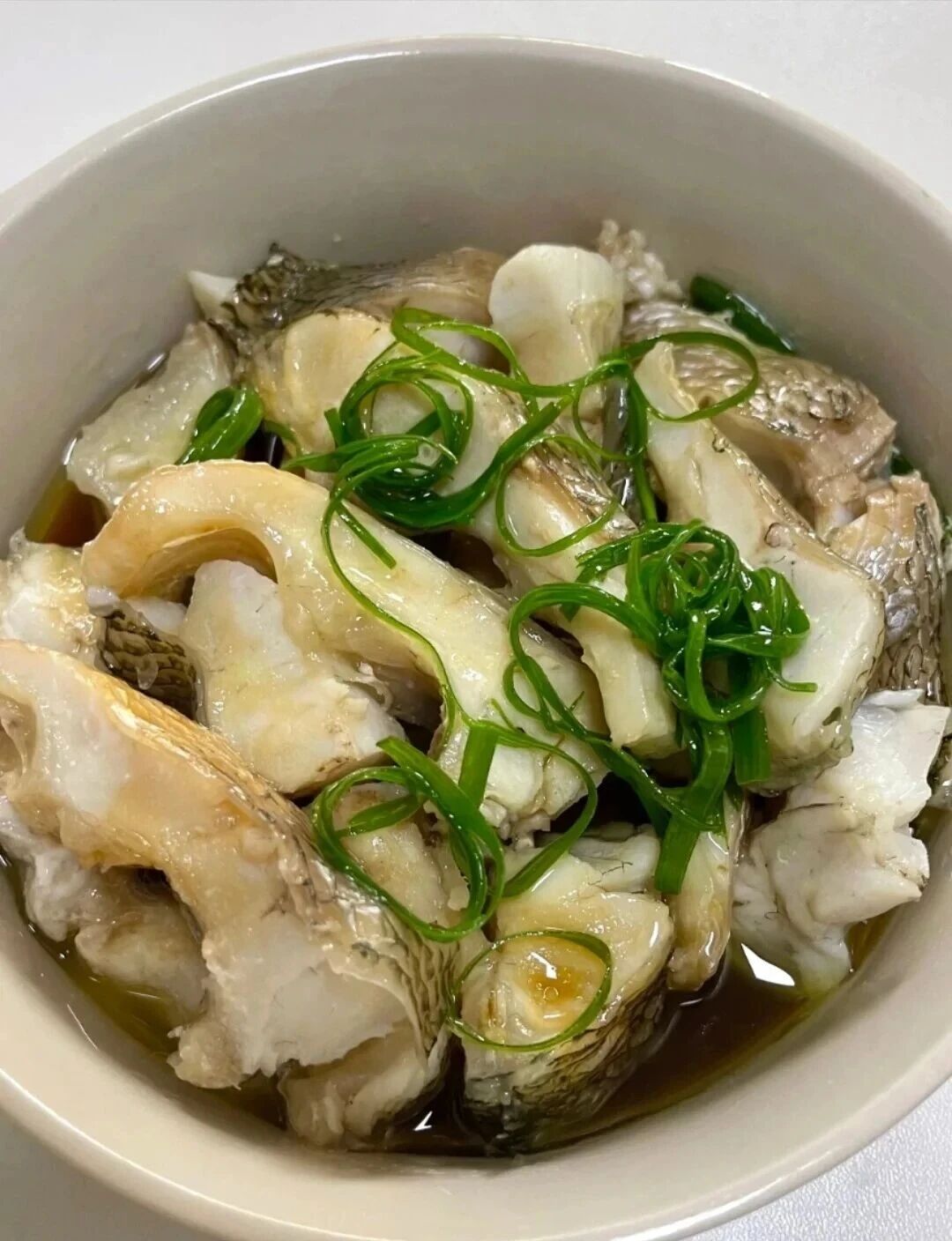 3. 倒掉盘中料汁,撒新鲜葱丝,淋蒸鱼豉油,浇上热油即可。