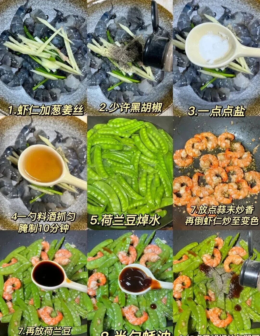 1. 虾仁加葱姜丝、黑胡椒粉、盐、料酒抓匀腌制10分钟;荷兰豆焯水,蒜切末。