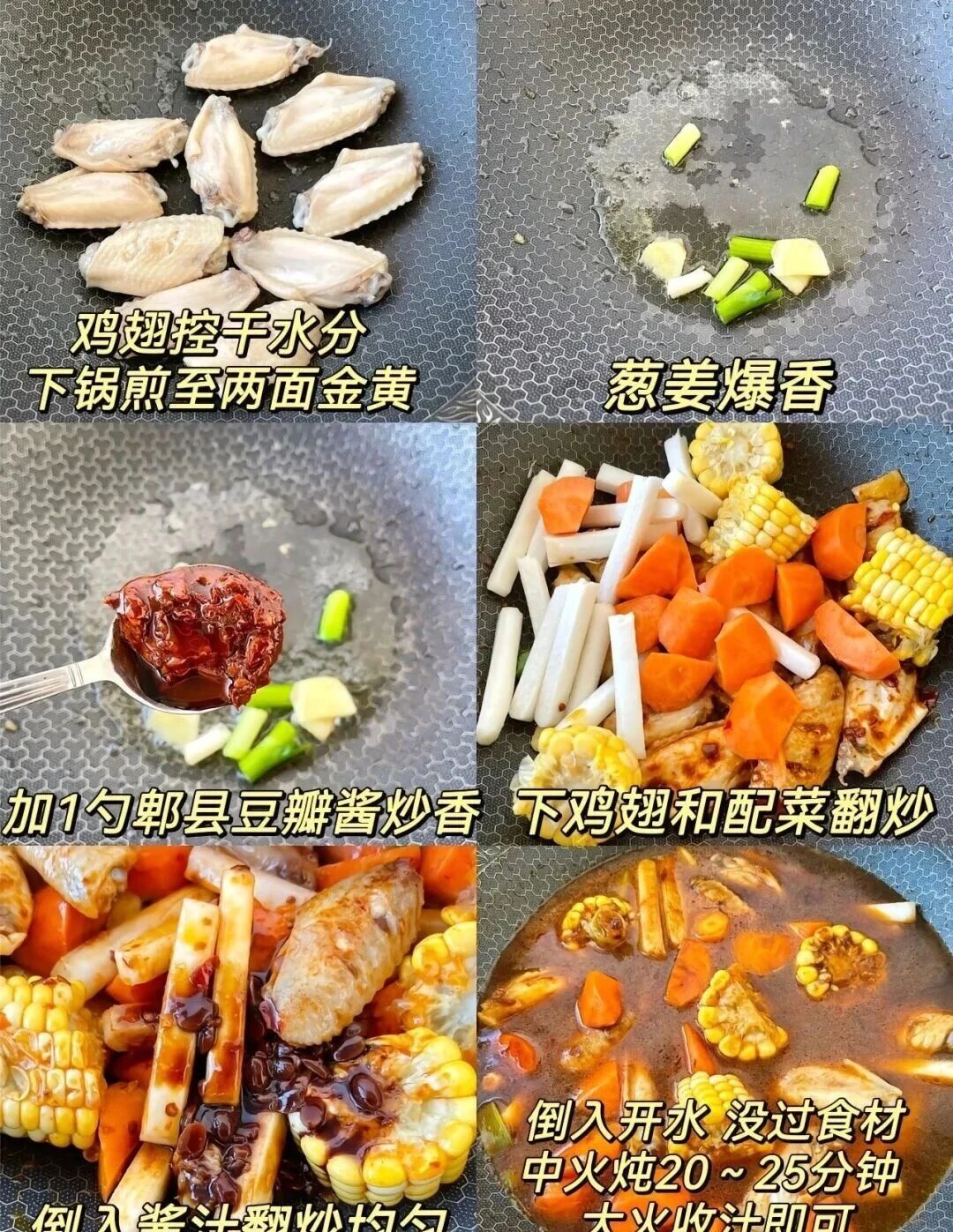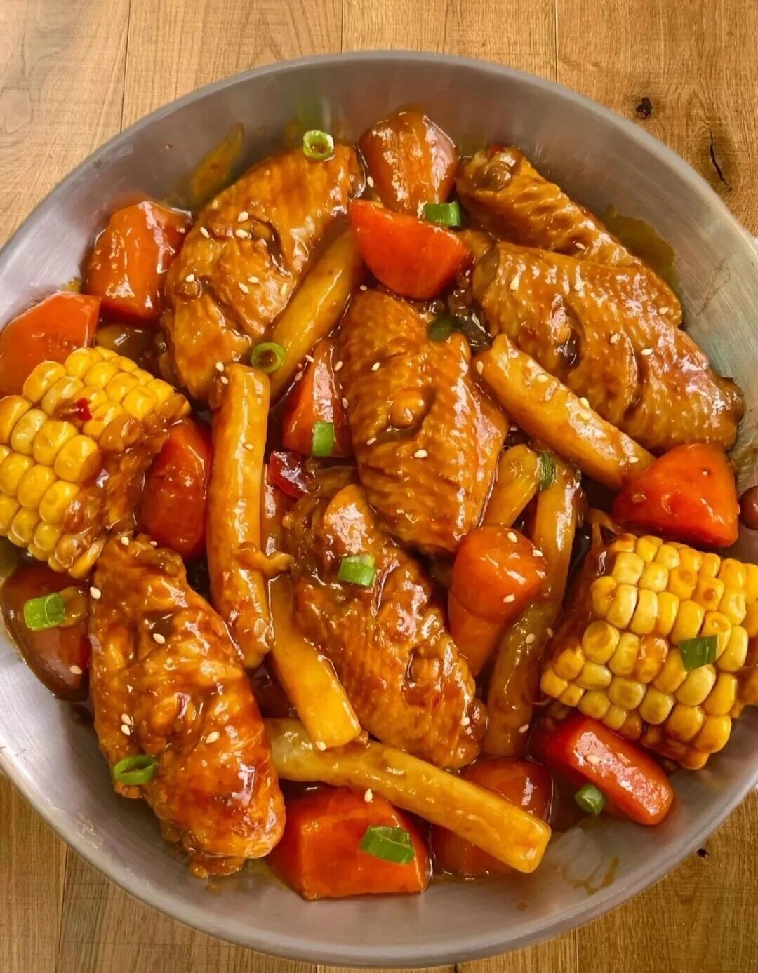 鸡中翅、玉米、红萝卜、年糕、小葱、熟芝麻、姜、蒜、生抽、老抽、蚝油、豆瓣酱、料酒、食用油