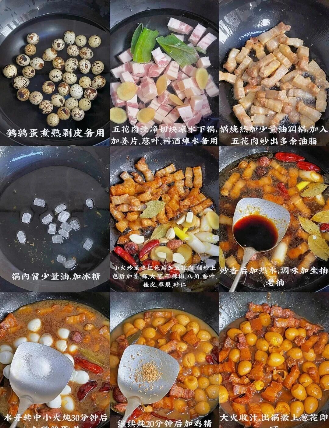 五花肉、鹌鹑蛋、冰糖、葱、姜、蒜、干辣椒、八角、香叶、桂皮、草果