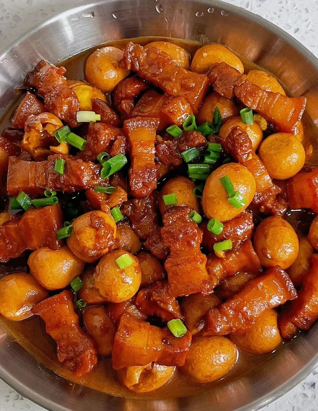5. 放入鹌鹑蛋、盐再炖20分钟,最后加鸡精大火收汁,撒葱花即可。