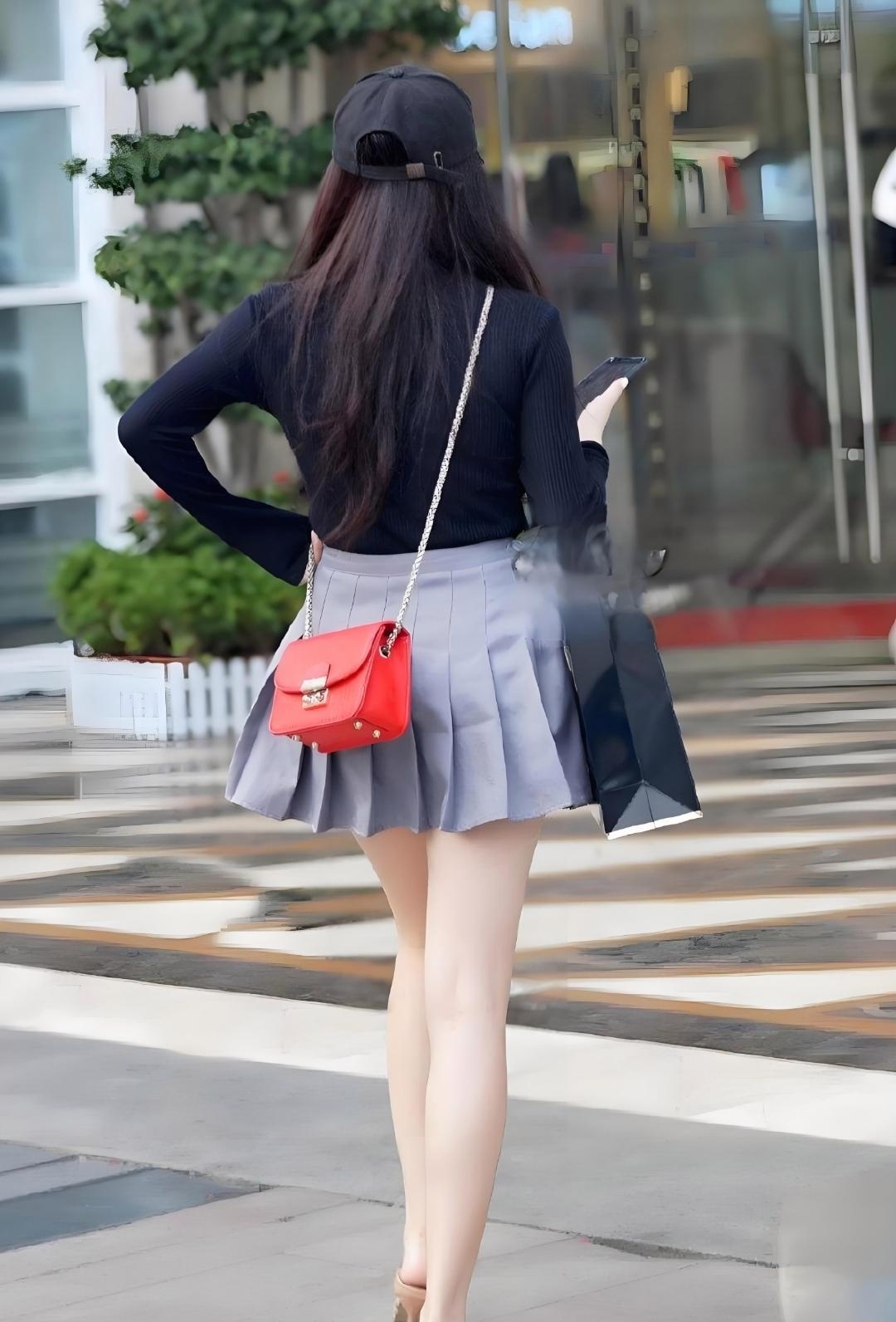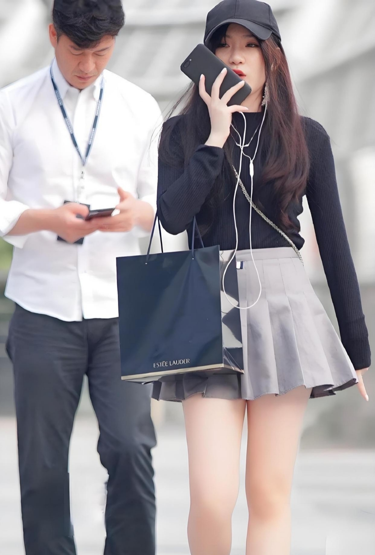行走在城市的喧嚣里,她低垂着眼眸与手机对话,似将心事藏进指尖的触碰里。黑针织衫的冷冽裹着灰百褶裙的温柔,红唇却又透着一丝倔强。耳机线垂落的弧度,像一道隔绝外界的屏障,独自在人潮中,守着属于自己的那份安静与疏离。