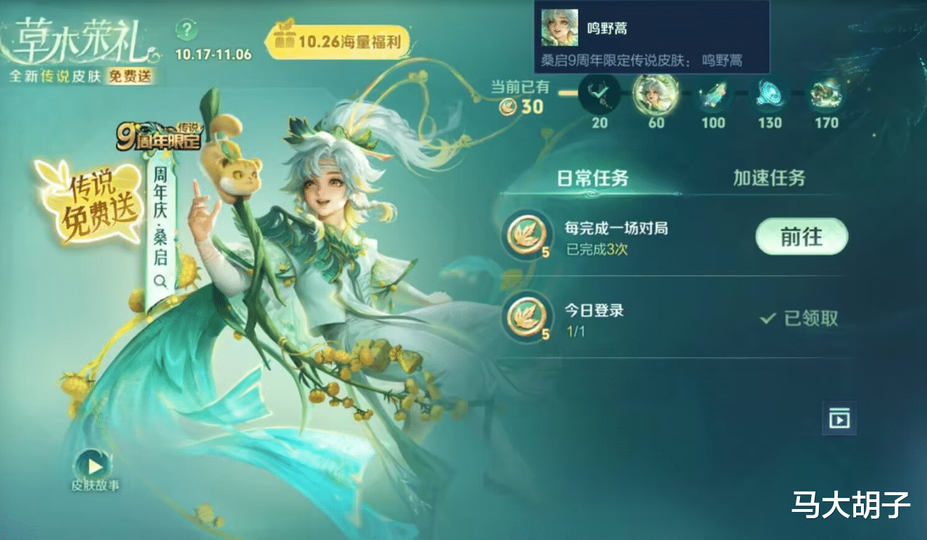 玩家参与草木荣礼活动,达到60积分可以直接获得9周年限定皮肤,该活动目前已开启数天,10月26日当天,前置积分足够的玩家,可以快速获取该皮肤。近期时间少的玩家,在10月26日,一定要登游戏,因为当天会赠送20积分,相当于日常活动积分的2倍!